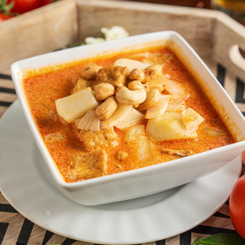Potatoes, onions, and massaman chili paste simmered in coconut milk. Topped with cashew nuts.