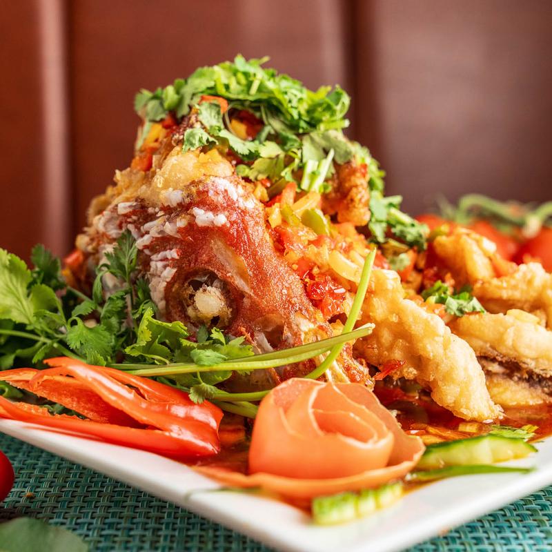 Deep-fried whole snapper topped with stir-fried onion, bell peppers, and cilantro in house-made three flavors sauce served with steamed broccoli on the side.
