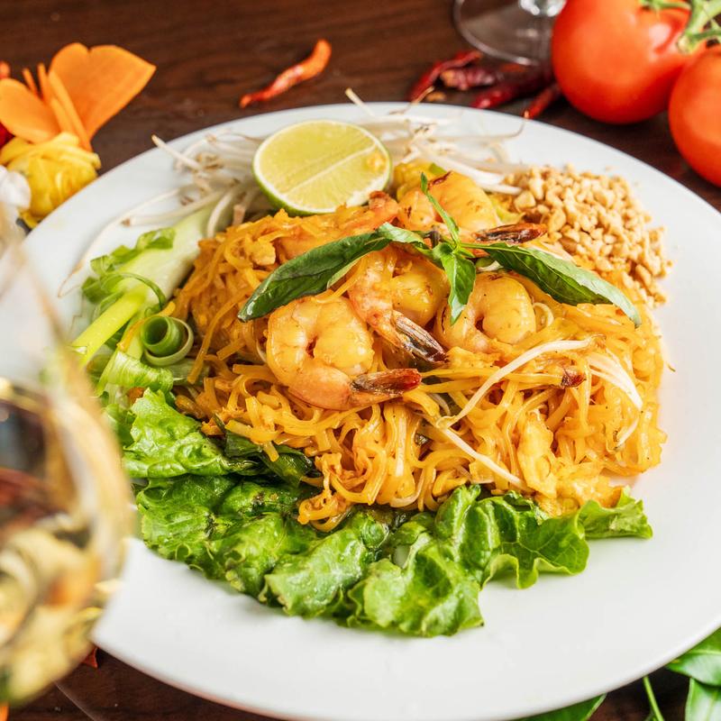 Stir-fried rice noodles with egg, bean sprouts, green onion, and house-made tamarind sauce. Served with crushed peanuts and lime wedge on the side.