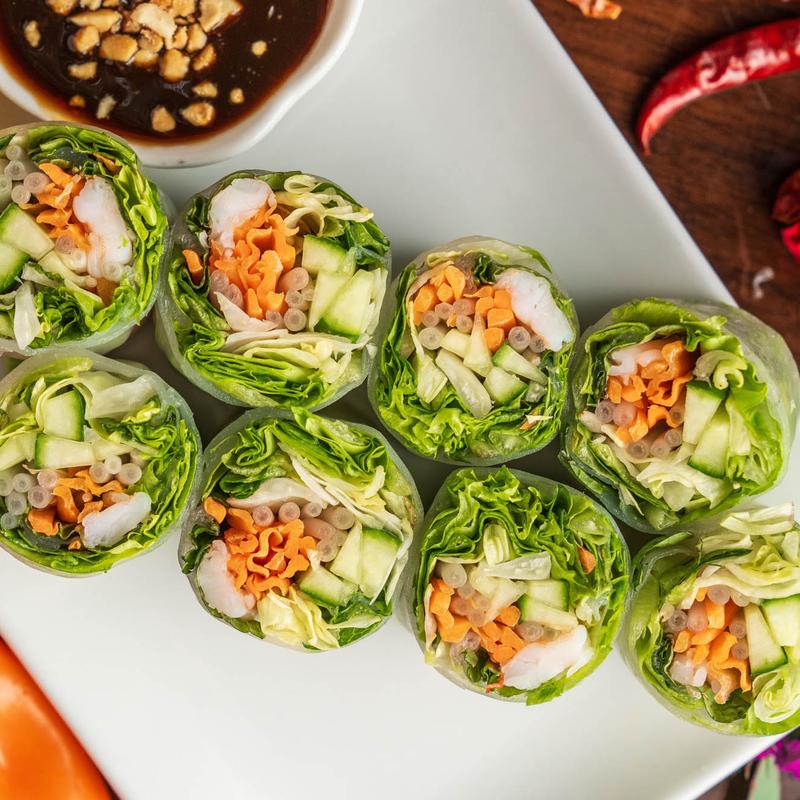 Fresh rice paper wrap stuffed with shrimp, organic greens, mint leaves, carrots, bean sprouts, and cucumber served with house-made plum sauce topped with crushed peanuts.